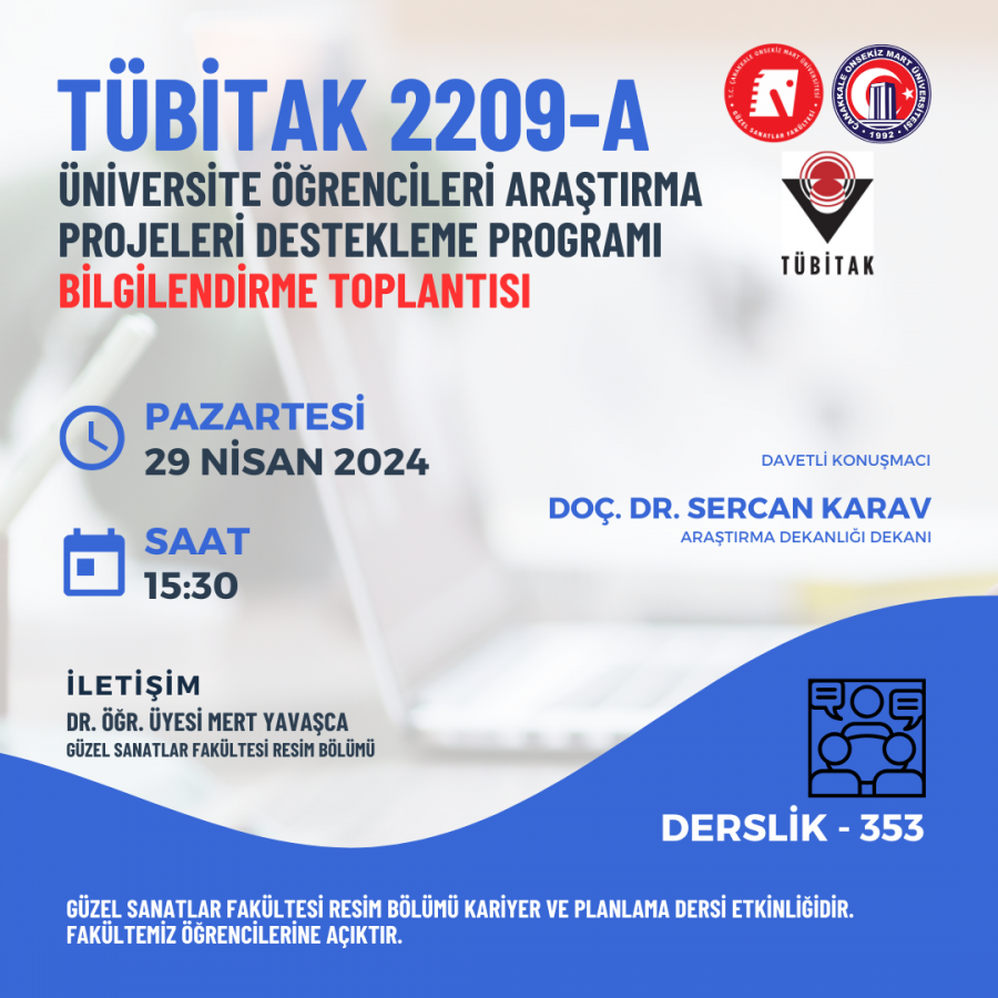 The informative meeting about "TÜBİTAK 2209-A/B Projects" of our faculty will be held on Monday, April 29, 2024 at 15.30 in classroom 353 with the participation of Assoc. Prof. Sercan Karav, Dean of the Dean of Research.