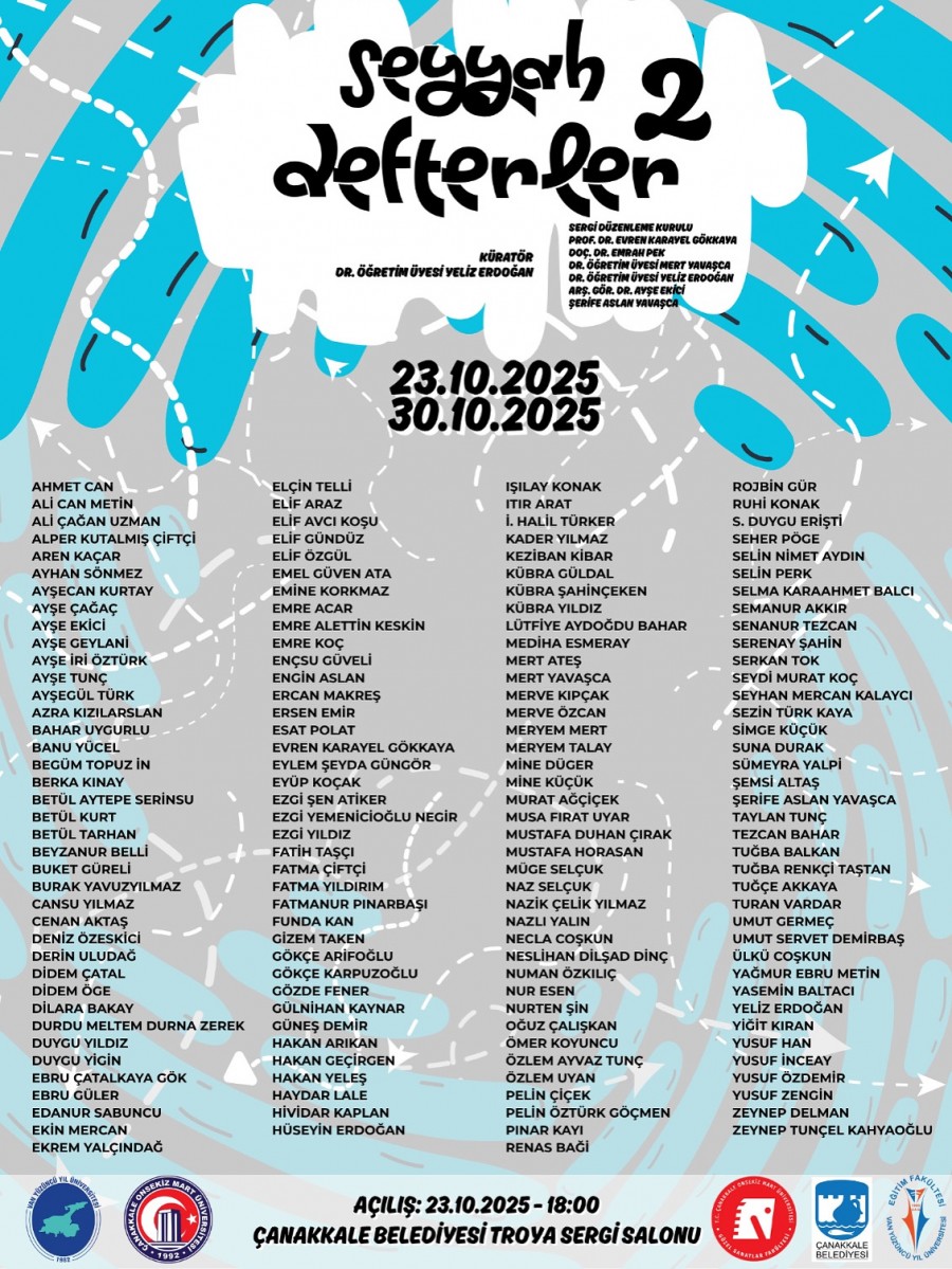 Van Yüzüncü Yıl Üniversitesi Eğitim Fakültesi Güzel Sanatlar Eğitimi Bölümü Dr. Öğr. Üyesi Yeliz Erdoğan'ın küratörlüğünü yaptığı ve ilki geçtiğimiz Mayıs ayında Van'da açılan "Seyyah Defterler" sergisi bu kez Van Yüzüncü Yıl Üniversitesi, Çanakkale Onsekiz Mart Üniversitesi ve Çanakkale Belediyesi iş birliği ile Çanakkale'ye geliyor.
