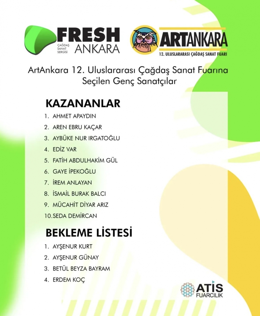 Bu yıl 12.si düzenlenecek olan ArtAnkara Uluslararası Çağdaş Sanat Fuarı'nda Fresh Ankaa IV. Çağdaş Sanat Sergisi kapsamında eserleriyle yer almaya hak kazanan mezunumuz İsmail Burak Balcı ve yüksek lisans öğrencimiz Aren Ebru Kaçar'ı tebrik eder; başarılarının devamını dileriz.